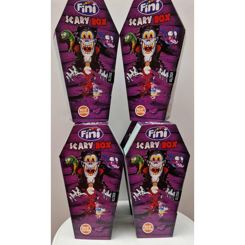 Chamallows, sucettes, chewing gums, rubans acidulés et gelées piquantes pourront être distribués aux enfants le 31 octobre. Un assortiment de bonbons Fini, enfermé dans cette boîte effrayante, spécialement fabriquée pour Halloween.