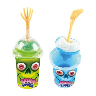 Une sucette torsadée géante en forme de cerveau dotée d'un bâton en forme d'os (de bras ou de jambe), à tremper dans un délicieux bonbon gel au goût fruité et acidulé.